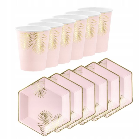 Zestaw 6 talerzyków i 6 kubeczków papierowych o pojemności 220 ml w kolorach złoto różowych. Średnica talerzyka 23 cm.