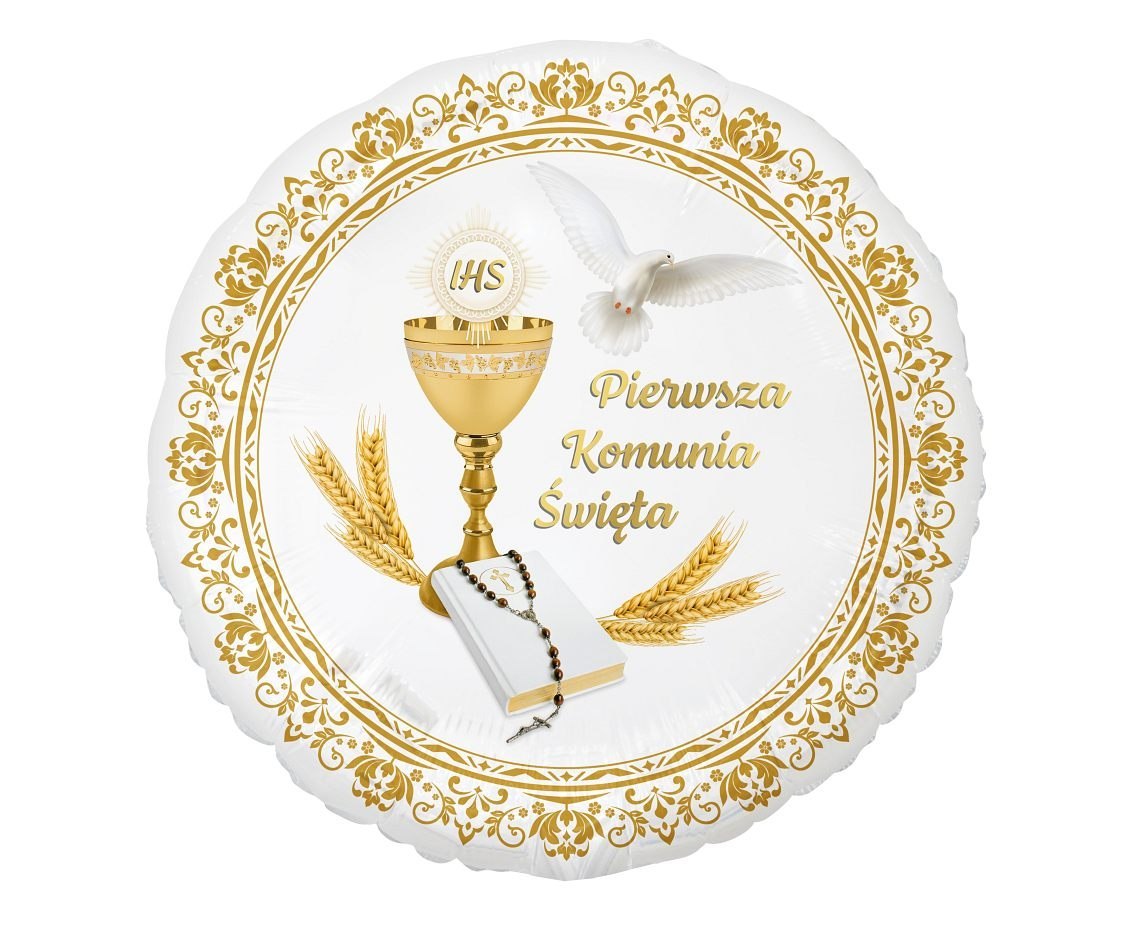 Dekoracyjny balon foliowy na Pierwszą Komunię. Piękny biało-złoty nadruk z motywami religijnymi podkreśli podniosły charakter uroczystości. Idealny jako prezent komunijny.