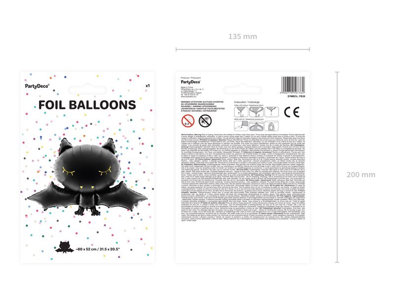Balon foliowy Nietoperz w kolorze czarnym ze złotym nadrukiem, wymiary ok. 80 x 52 cm (31,5 x 20,5"). Trwały, w żywych kolorach - wywoła uśmiech u każdego. Nadaje się do pompowania powietrzem albo helem - latający zrobi jeszcze lepsze wrażenie. Balon z helem może być miłym dodatkiem do głównego prezentu lub zastąpić kwiatek. Pompując balon helem pamiętajmy, żeby nie narażać go na skrajne warunki pogodowe ponieważ balonik najlepiej czuje się w temperaturze pokojowej.