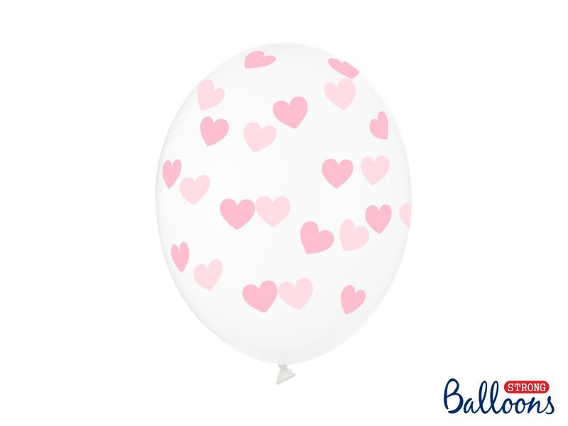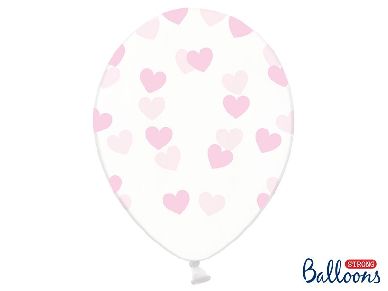 Balony Strong Serduszka w kolorze Crystal Clear, z jasnoróżowym, pięciostronnym nadrukiem, średnica 30 centymetrów.