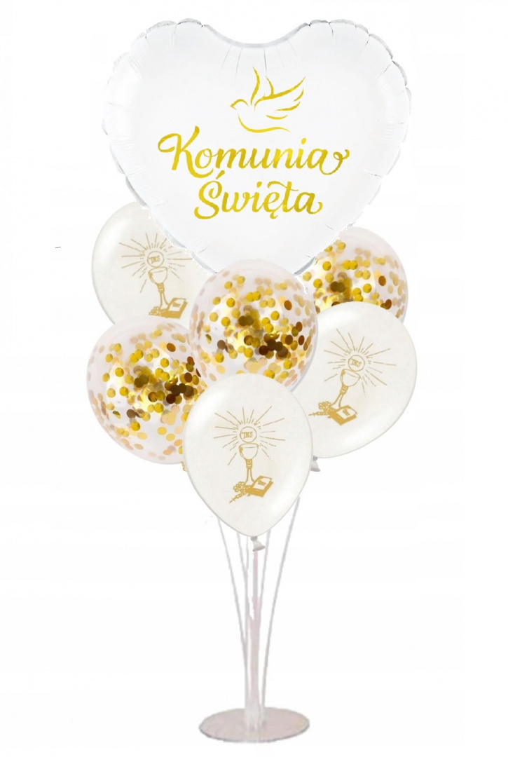W komplecie znajdą Państwo balony przeźroczyste ze złotym konfetti w środku (3 sztuki), białe pastelowe balony ze złotym komunijnym motywem (3 sztuki), a dopełnieniem wszystkiego jest śliczny i elegancki balon foliowy w kształcie serca z napisem "Komunia Święta