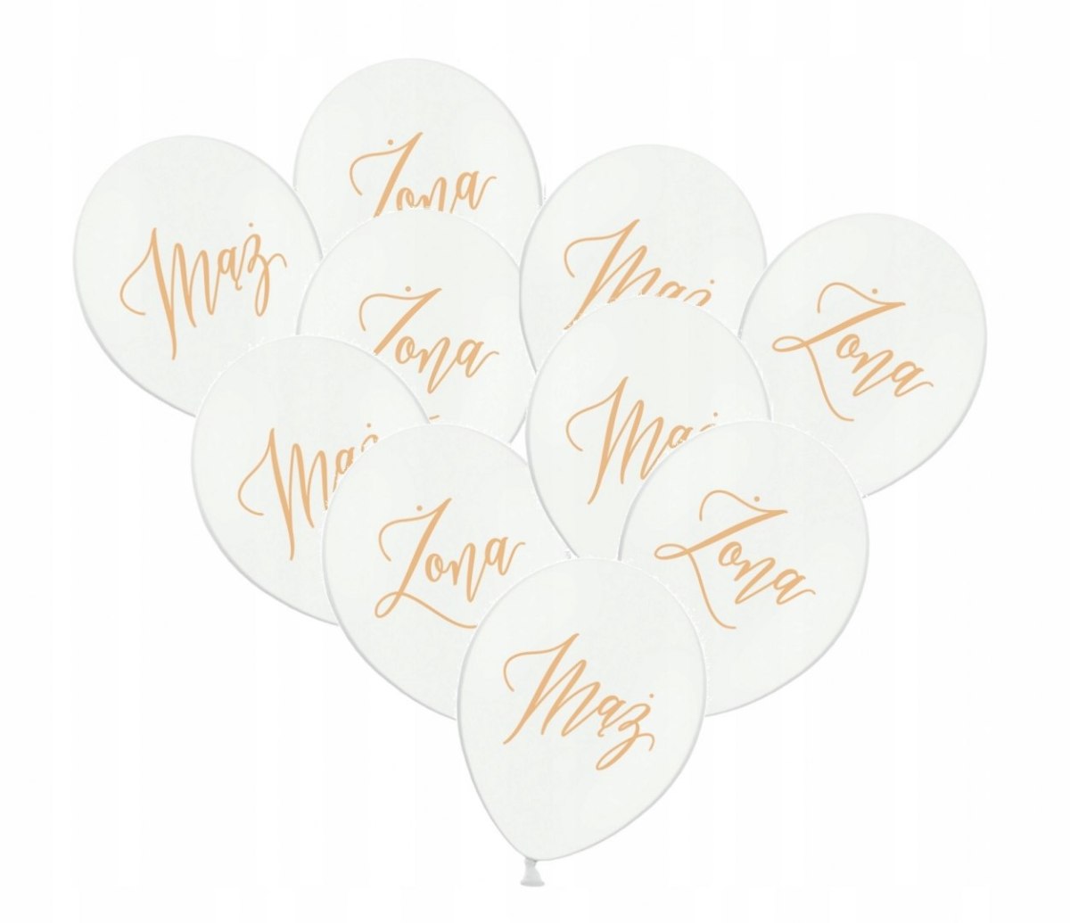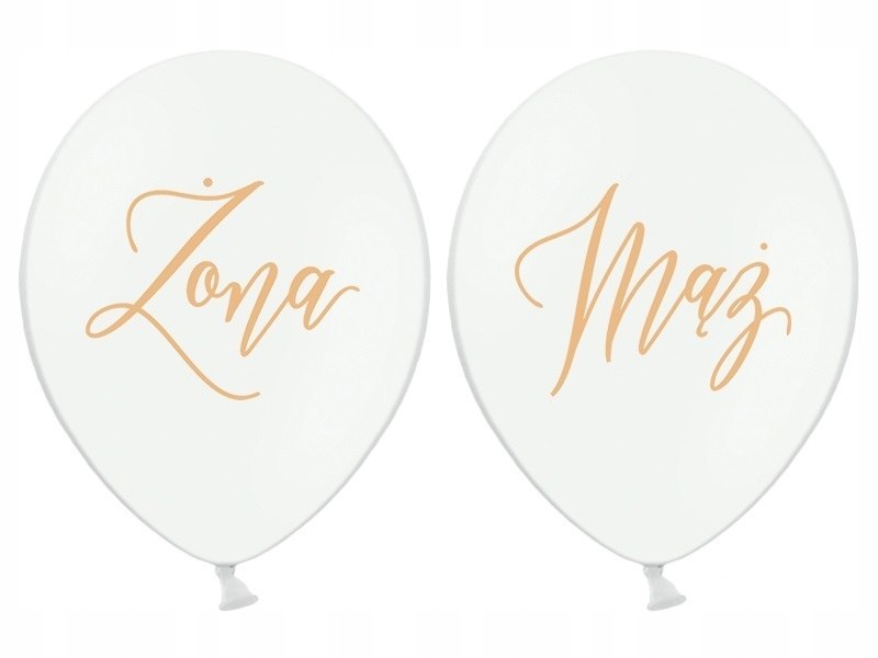 Zestaw 10 białych, pastelowych balonów składający się z 5 balonów ze złotym dwustronnym nadrukiem "Żona" oraz 5 balonów ze złotym dwustronnym nadrukiem "Mąż". Balony są świetną ozdobią salę weselną i znakomicie sprawdzą się jako "dekoracja za Młodą Parą"