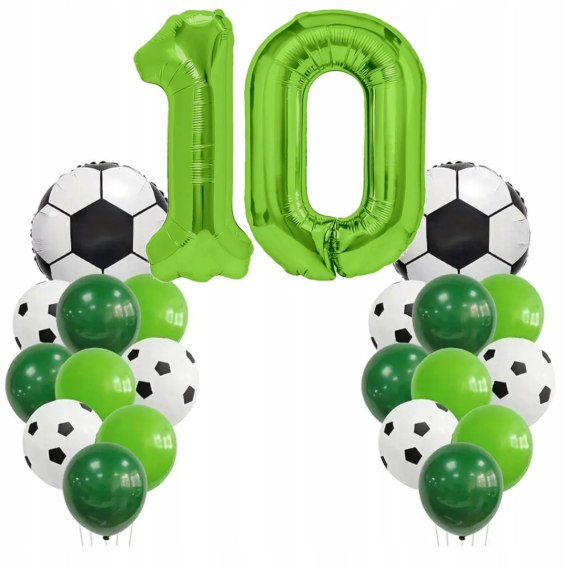 Kompletny zestaw 22 balonów na piłkarskie urodziny dla 10 latka. W skład zestawu wchodzą: