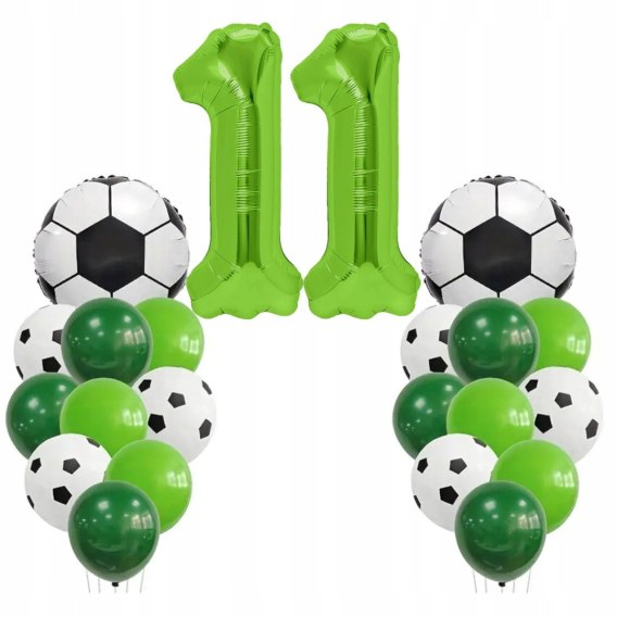 Kompletny zestaw 22 balonów na piłkarskie urodziny dla 11 latka. W skład zestawu wchodzą: