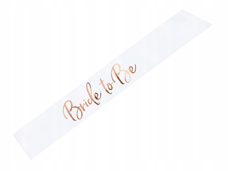 • Szarfa satynowa Bride to be w kolorze białym z metalicznym nadrukiem w kolorze różowego złota, szerokość ok. 10 cm, długość ok. 75 cm.
