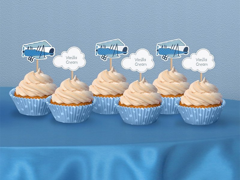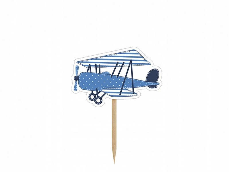 Toppery na tort lub do muffinek. Swietnie komponują się z pozostałymi dekoracjami w temacie chmurek i samolotów. Zestaw zawiera 3 toppery z samolotami i 3 z chmurkami. Wysokośc ok 10 cm