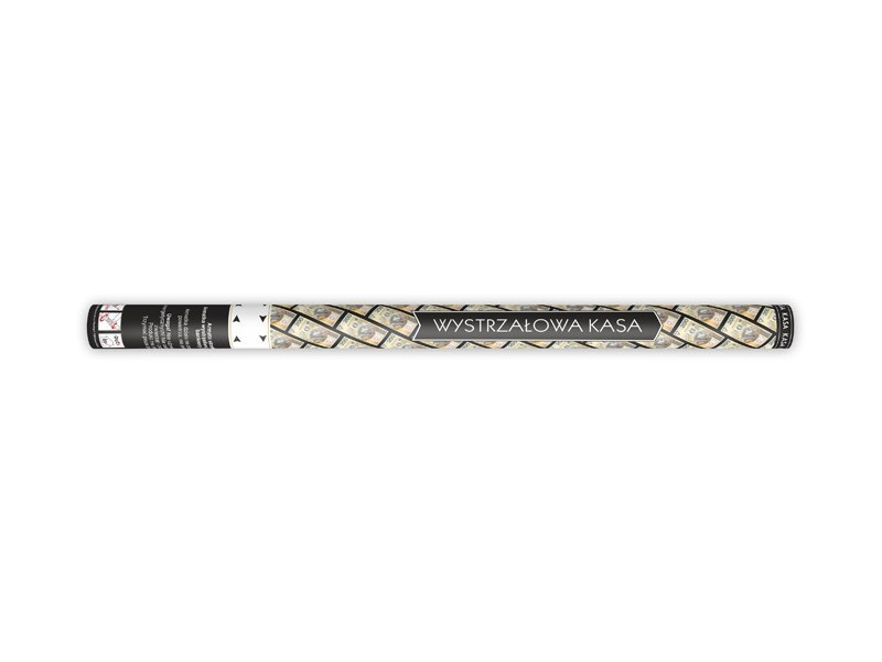 Tuba strzelająca papierowymi banknotami 200 PLN, długość 80 centymetrów.