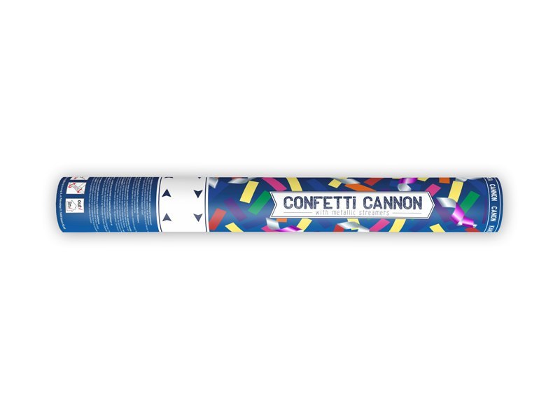 Tuba strzelająca papierowym, kolorowym konfetti i metalicznymi serpentynami, długość 40 centymetrów.