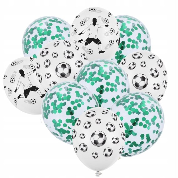 Zestaw 10 dużych balonów lateksowych o rozmiarze 30cm. W komplecie znajduje się 5 balonów przezroczystych z zielonym konfetti oraz 5 balonów białych z motywami piłkarskimi. Balony nadają się do pompowania helem oraz powietrzem (nie będą się unosiły).
